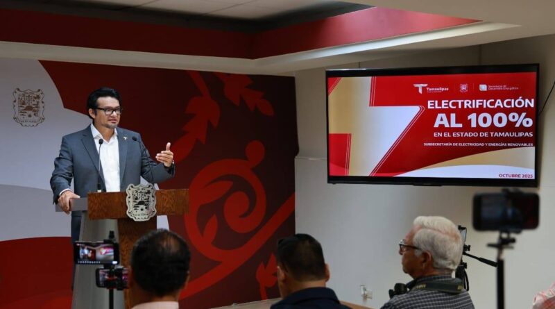 Ciudad Victoria, Tamaulipas.- En conferencia de prensa, el secretario de Desarrollo Energético, Walter Julián Ángel Jiménez, presentó el avance del programa “Electrificación al 100%”, donde señaló que Tamaulipas se convertirá en el primer estado del país en concretar la electrificación en todo el territorio.
