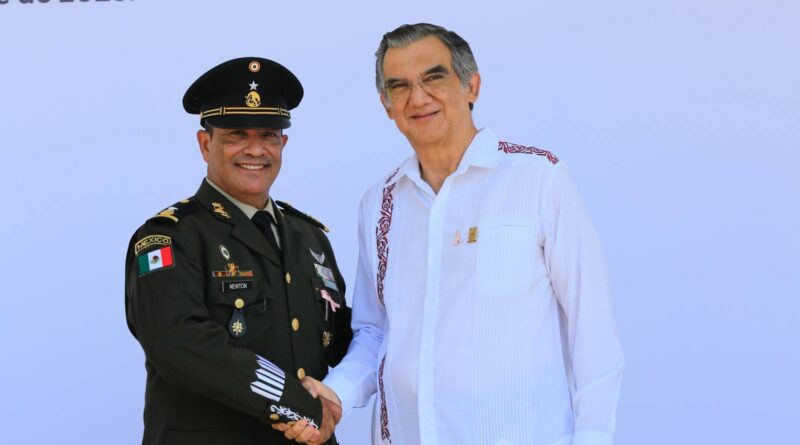 Ciudad Victoria, Tamaulipas. – El gobernador Américo Villarreal Anaya asistió como invitado de honor a la toma de posesión al cargo y protesta de bandera del general brigadier de Estado Mayor, Newton Manuel Chávez Baños, como comandante interino de la 48 Zona Militar.