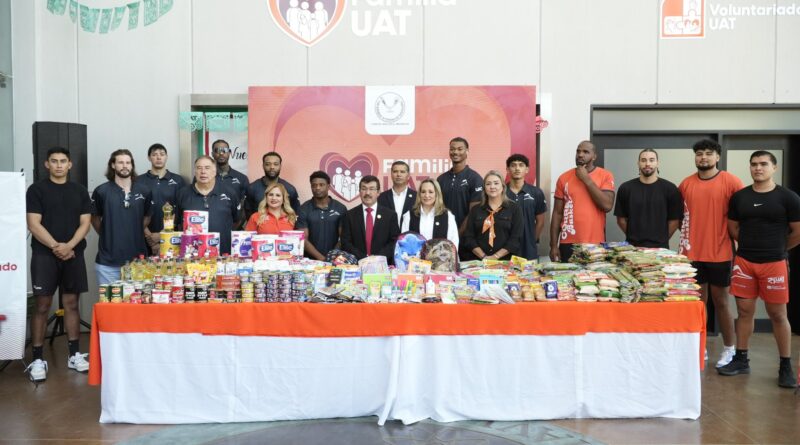 El rector de la Universidad Autónoma de Tamaulipas, Dámaso Anaya Alvarado, acompañado de su esposa, la Lic. Isolda Rendón de Anaya, presidenta de Familia UAT, recibió, del Club Correcaminos de basquetbol profesional (Correbasket), un donativo de víveres y útiles escolares recaudados por el equipo durante sus encuentros en el Gimnasio Multidisciplinario de Victoria, dentro de la Temporada 2025 de la Liga Caliente MX LNBP.